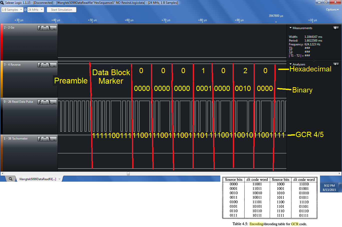 So, armed with this information, and after much study, trial-and-error, and meeting with many VERY smart people who had some concept about how data was commonly read from magnetic flux transition on other 1980s computer peripherals, I was able to scroll through the Saleae Logic Analyzer capture file, and find the first block of data.