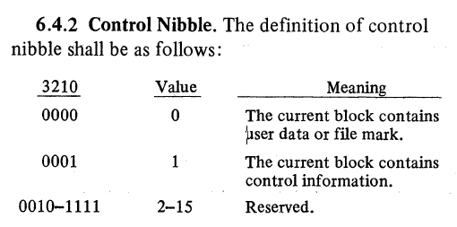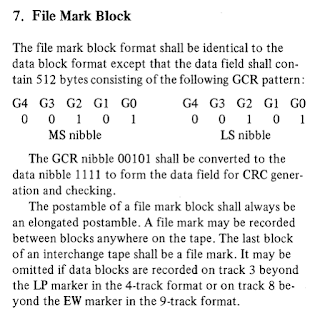 The file mark block format shall be identical to the data block format except that the data field shall contain 512 bytes consisting of the following GCR pattern: 00101 (see excerpt pictured below)
